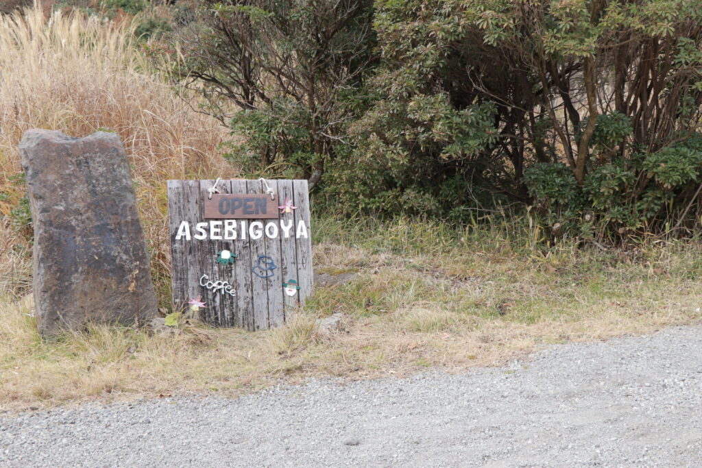 法華院温泉山荘に続く林道を進むとあせび小屋の看板が見えてきます